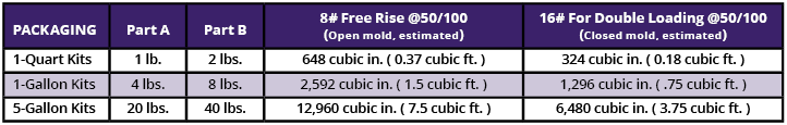 - Density is based off of free-rise, unrestricted samples. Typical castings in a closed mold with back pressure will increase density and reduce expansion rate. This will often require up to 1.5 to 2.5 times more foam than theoretical calculated amount of foam for a given volume and mold shape/goemetry. Also temperature of liquid foam, relative humidity, and mixing technique (hand stirred vs jiffy mix with a drill) will also affect expansion rate of foam.