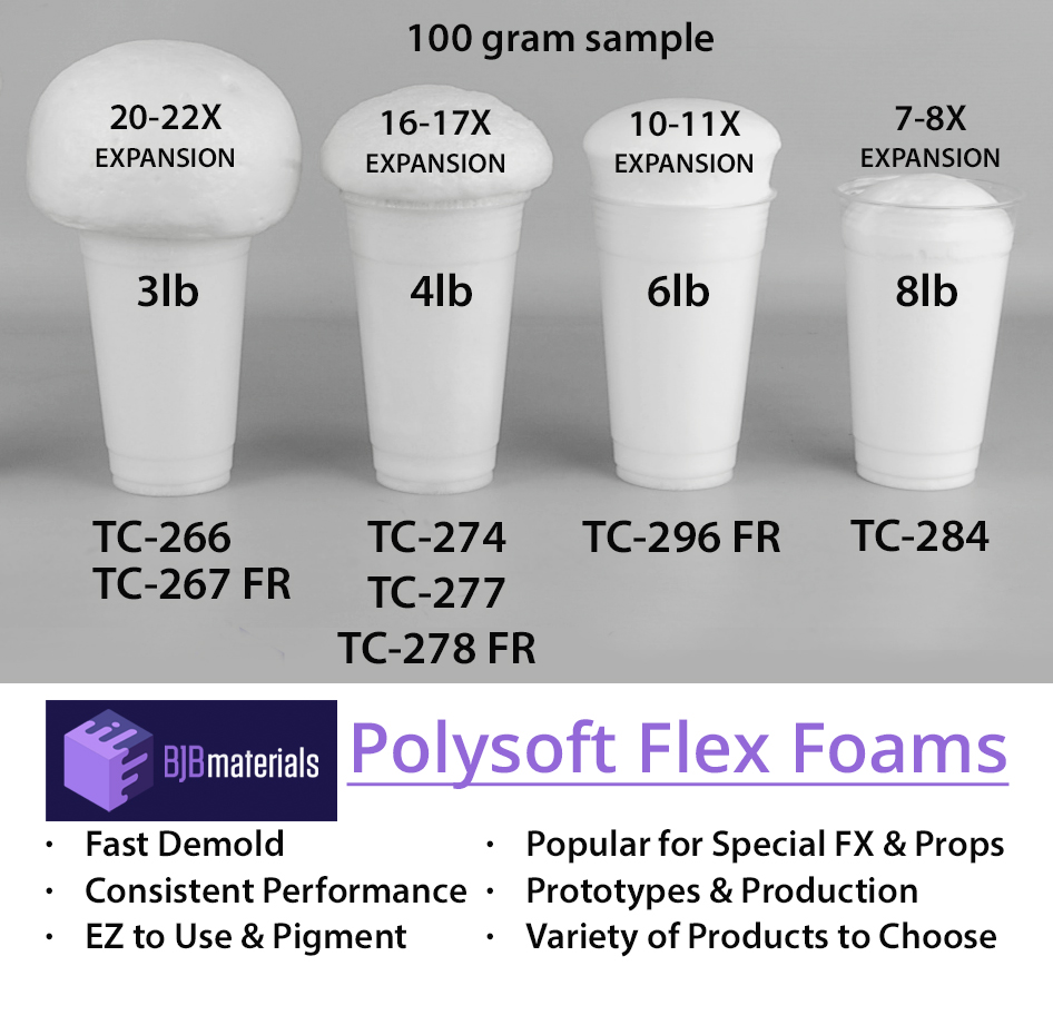 TC-284 is a two-component, self-skinning, flexible polyurethane foam. The cured material feels similar to an auto arm rest pad. BJB’s 6800 Series Pigments may be added to the “B” side for developing a wide range of colors. End users can adjust firmness with a slight ratio change as listed below. Common applications are prototypes, bumper/crash pads, arm rests, movie special effects props and more. Skin thickness is controlled by material/ mold temperature, and the loading of the mold.