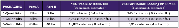 NOTE: Density is based off of free-rise, unrestricted samples. Typical castings in a closed mold with back pressure will increase density and reduce expansion rate. This will often require up to 1.5 to 2.5 times more foam than theoretically calculated amount of foam for a given volume and mold shape/geometry. Also temperature of liquid foam, relative humidity, and mixing technique (hand stirred vs jiffy mix with a drill) will also affect expansion rate of foam.